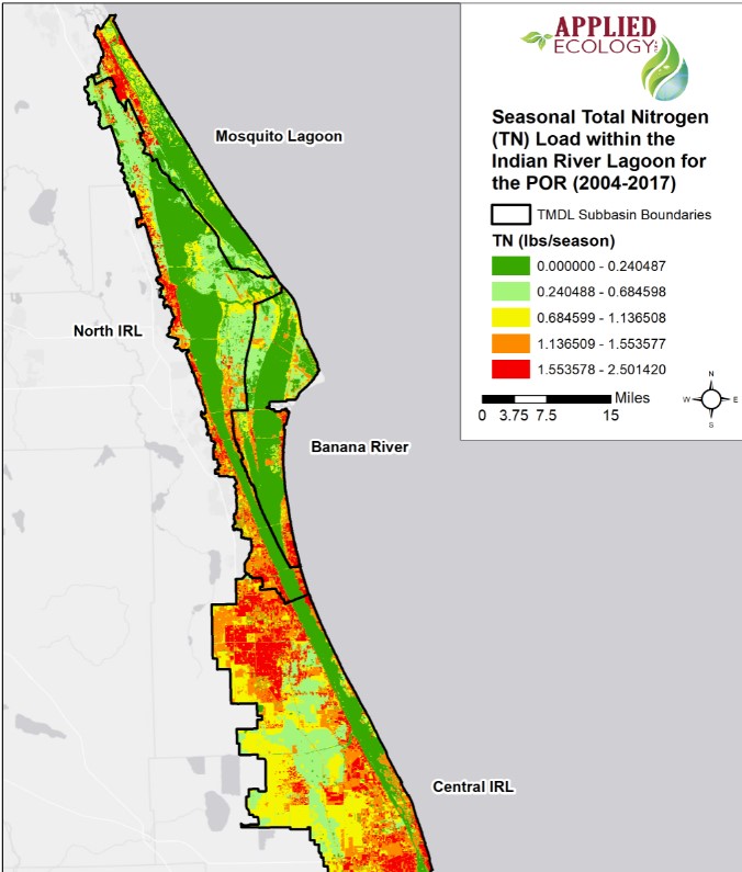 Description: To produce the baseload layers that will allow estimating baseloads (and subsequently load reductions) from small BMPs, such as swales, relatively small input grid cells must be utilized in the basin layer that is one of the inputs to the custom SWIL 4.0 model run. Previous efforts determined the polygon grid cell size to be acceptable at 2500 square meters. A grid layer of 50-meter by 50-meter cells was created to cover the entire spatial extent. This resulted in over 1 million grid cells to cover the entire watershed. It is important to note that partial grid cells along the extent boundary with an area of less than 500 square meters were removed from the grid layer prior to model execution due to limitations of the SWIL model. For those partial grid cells, values were calculated post-model execution utilizing the normalized loads of the closest adjacent grid cell to assign an accurate load.In order to efficiently run the model with this large of a basin (grid) count, mean rainfall and ET rasters were created for years 2004-2017. This allowed the model to be executed as a single year. Aggregated rainfall rasters were created by averaging the identical months for each year for the POR (2004-2017). For the evapotranspiration rasters, the MOD 16 data product is only available for the years of 2000-2014. To account for this lapse in data from 2015 to 2017, monthly mean rasters were created for the POR in which the measured ET data was available (i.e. the average of identical months for every year from 2000 to 2014). The mean POR ET rasters were then used for years 2015-2017. Once the model outputs were generated by the execution of the model, the period -of-record mean annual and dry season (January - May) tabular values were joined to the spatial grid cell layer. The outputs of each grid cell was then normalized by using the area of each grid cell. The normalized results included in this layer are representative of annual and dry season (January through May) sums for direct runoff, baseflow and total (direct runoff + baseflow) values of three parameters (volume, total nitrogen (TN), and total phosphorus (TP)) per grid cell. A verification model run was performed in order to validate the results of the basin load layer. The verification model run consisted of using the complete monthly (2004-2017) temporal extent for the rainfall and ET rasters for three relatively small areas and comparing the outputs to the basin load layer. The results of the verification analysis demonstrated no significant difference whether average rasters were used or all the monthly rasters for the entire POR were used.
